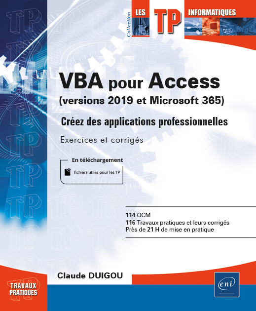 À partir des exercices pratiques de ce livre, tous les utilisateurs d’Access, en version 2019 ou Microsoft 365, seront capables de créer ou d’améliorer des applications VBA Access en bénéficiant des astuces, des méthodes et du retour d’expérience de développeurs.