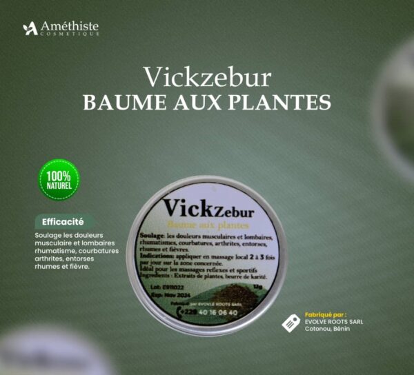 Le baume aux plantes Vickzebur de la gamme Amethiste Cosmetics de la société EVOLVE ROOTS est un produit formulé pour valoriser les plantes africaines. Cette préparation est conçue à partir d’huile essentielle de menthe poivrée, d’extraits de plantes tels que Anonnas Senegalensis, Aframomum Melegueta et Syzygium Aromaticum. Le baume a pour but de remplacer ou de compléter les formes traditionnelles utilisées en Afrique pour traiter divers maux tels que le rhume, la fièvre, les douleurs musculaires, lombaires ou articulaires.